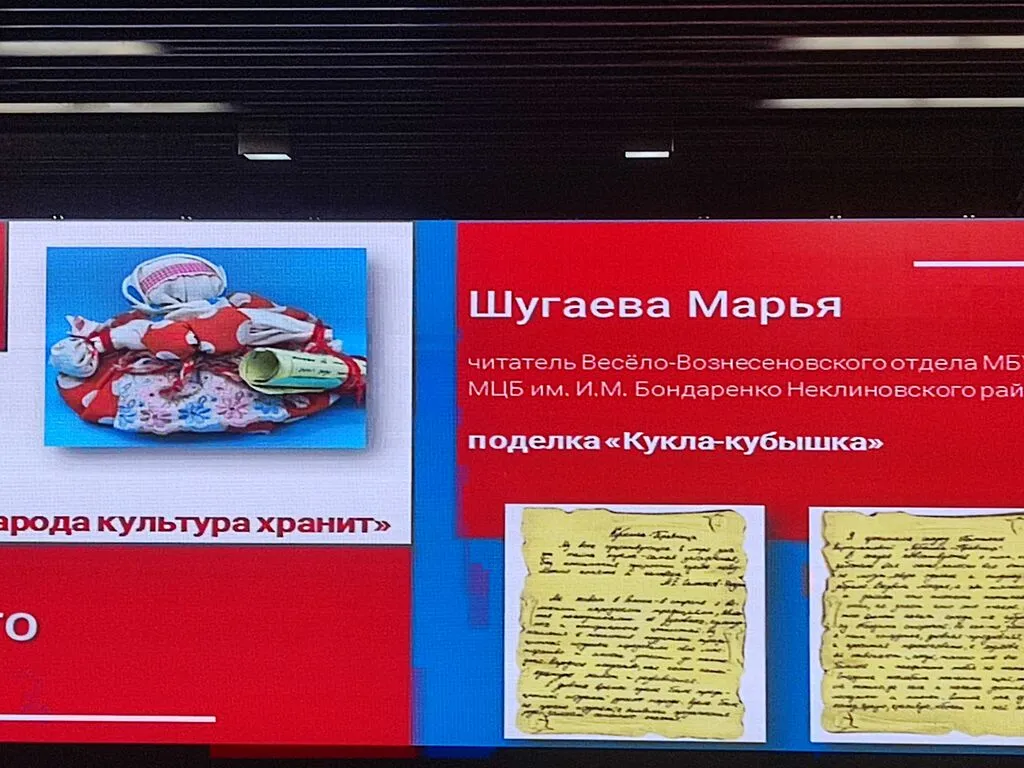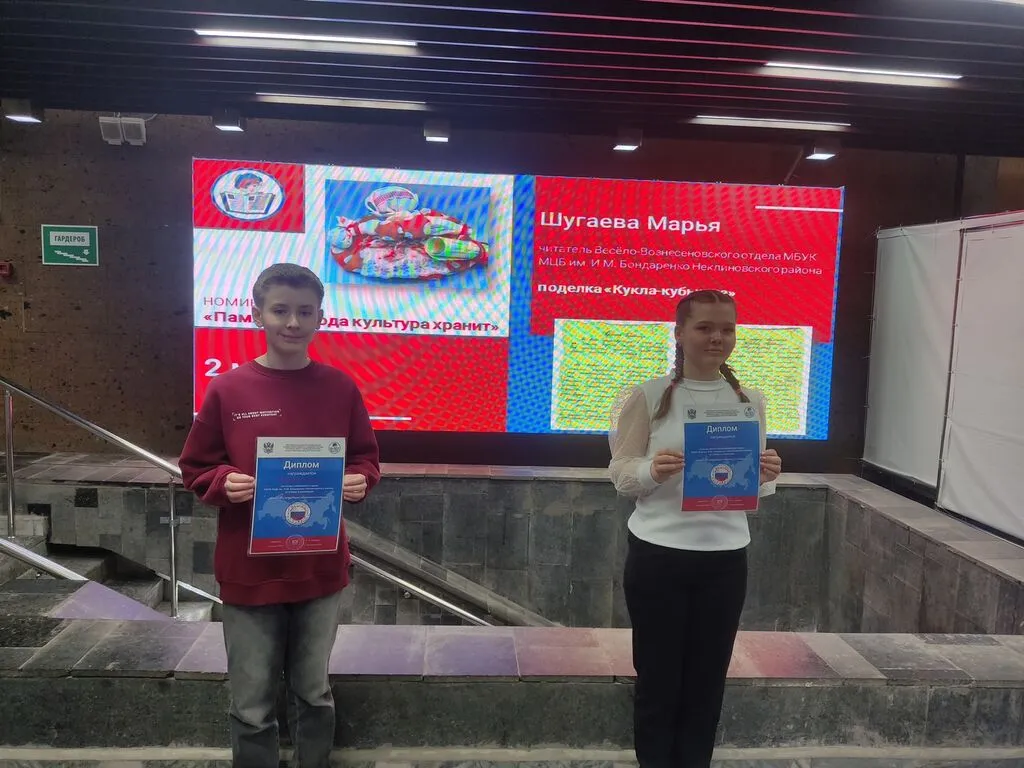 В рамках Недели детской книги 27 марта в г. Ростове-на-Дону были подведены итоги областного литературно-творческого конкурса по привлечению детей к чтению "Вместе мы Россия". В нем принимали участие 1119 читателей из 32 муниципальных образований ( 23 района и 9 городов) Ростовской области. Читатели Неклиновского района принимали участие в данном конкурсе и заняли призовые места. В номинации "Народы дружат книгами" для читателей 8-11 лет 1-е место Назарова Алеся Краснодесантский отдел м.Марко Вовчок, в номинации "Память народа культура хранит" для читателей 12-14 лет 2-е место у Шугаевой Марьи за поделка "Кукла -кубышка" и эссе по сказке Т.Карюшатовой "Кукла травница", 3-е место у Степана Панченко за видеоролик "Как память народа культура хранит" Самбекский отдел.