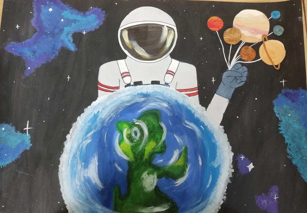 Шугаева Марья 13 лет представляет свою работу в номинации«Галактика красок», рисунок "Покорители космоса".